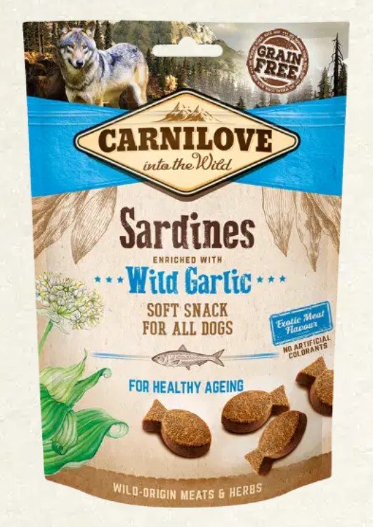 Delicious sardines, semi-moist snack for the ultimate tasty treat and perfect complement to your dog’s regular diet. With wild garlic for healthy ageing.